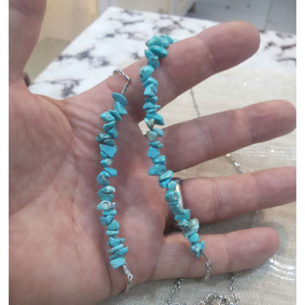 حصول حاضر نیم ست سنگ طبیعی فیروزه می باشد. کاربرد آن زنانه و برای رده های سنی نوجوانان ، جوانان و بزرگسالان مناسب است. زنجیر و قفل به کار رفته در آن استیل کاملا رنگ ثابت می باشد. از لحاض خواص سنگ فیروزه دفع کننده نیروهای منفی و زخم چشم ، ضد استرس و اضطراب و تقویت کننده قبل می باشد